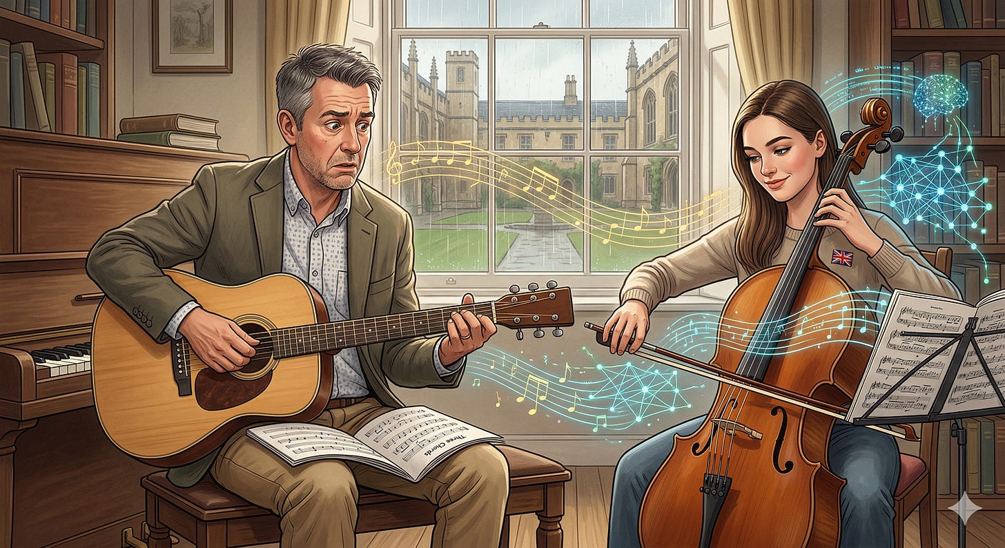 When I talk to her about technology, I am the one operating from a place of deep expertise, often wondering why she doesn’t catch on faster. The guitar and the cello showed me exactly what it feels like to be on the other side of that equation.
