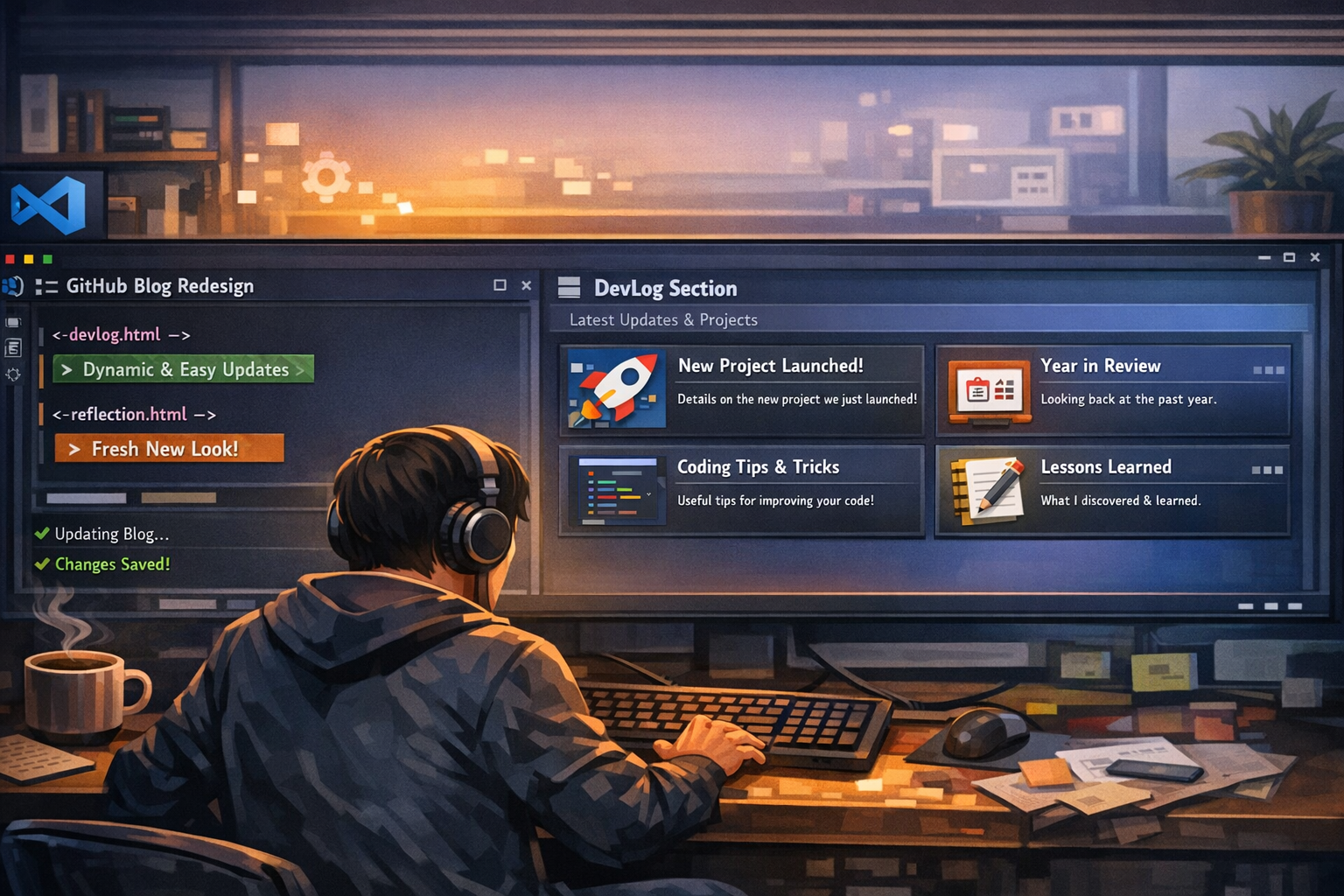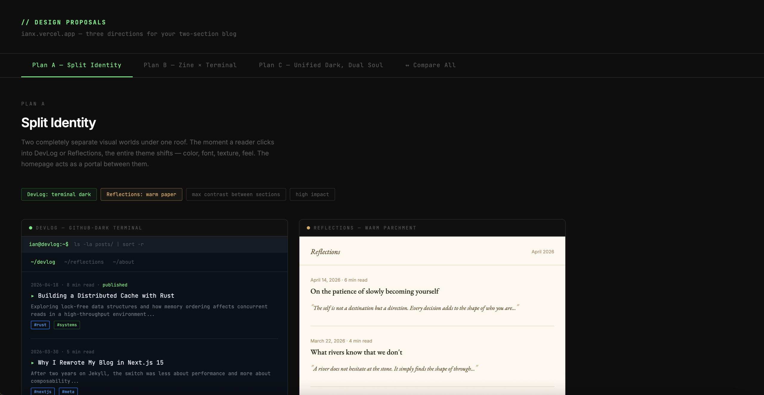 This one went all in on the contrast. DevLog gets a full GitHub-dark terminal theme with monospace everything. Reflections switches to warm paper with serif typography. Click between sections and the whole site's personality flips.