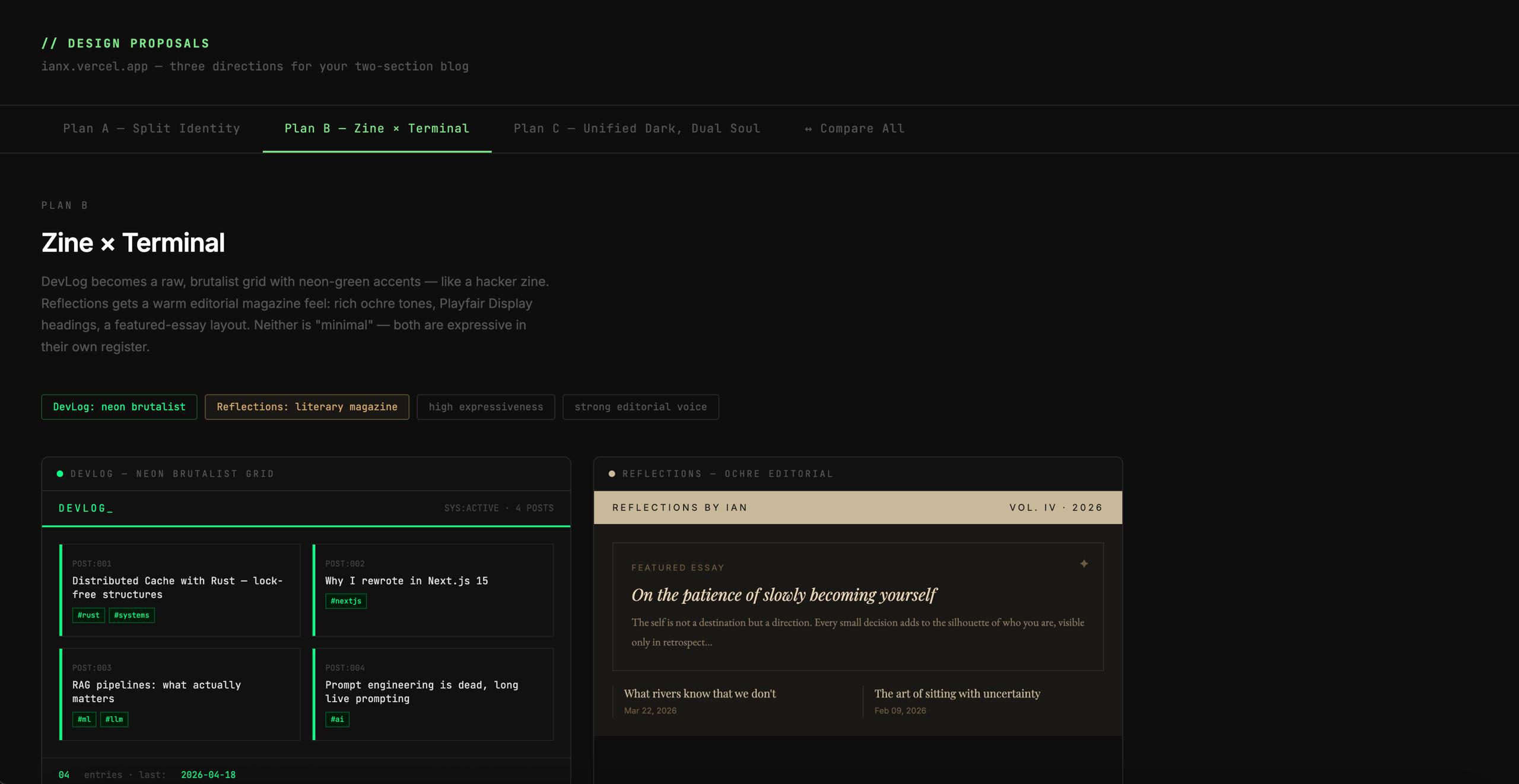 This one turned everything up to eleven. Brutalist neon grid for DevLog, warm ochre editorial magazine for Reflections. It's the most distinctive, the most artistic, the most... extra.