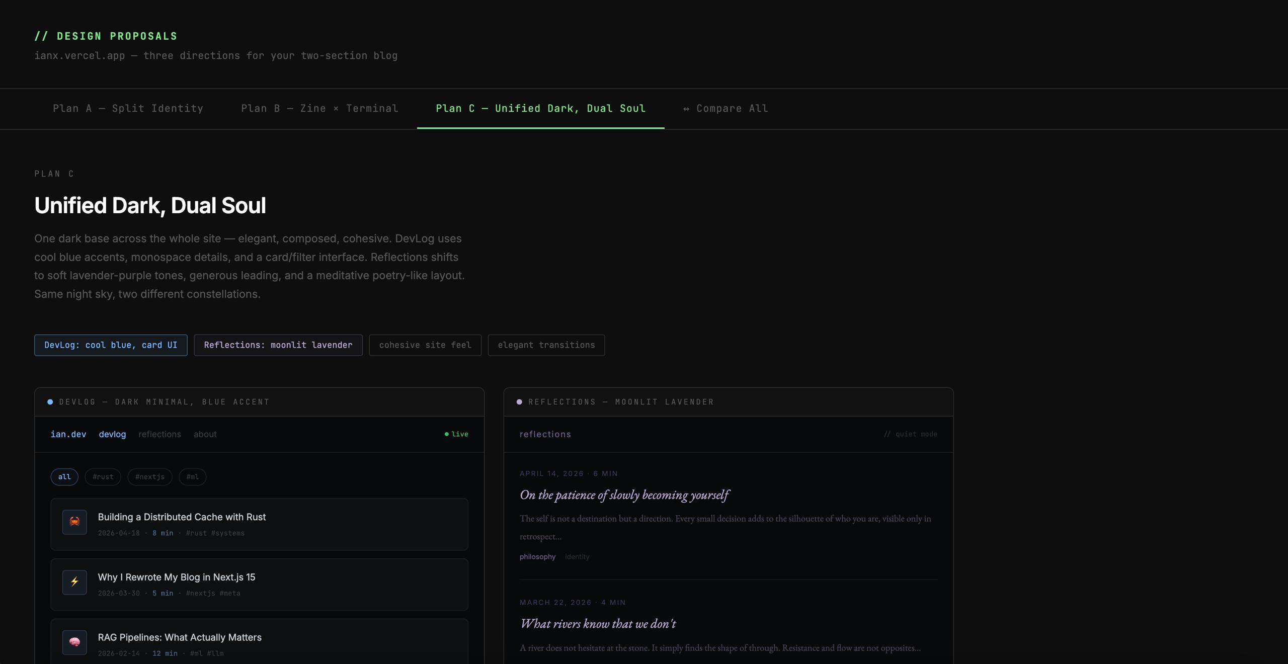 "Plan C fits your vision most naturally. You want two sections with different souls, but you also care about clean and minimal — which points toward a unified aesthetic rather than a jarring split."